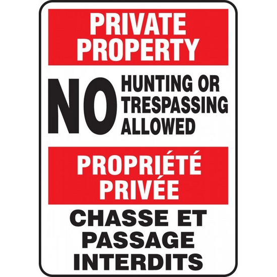 Accuform, FBMATR540VA, 14" x 10" Aluminum Bilingual Private Property Safety Sign: "No Hunting Or Trespass..."