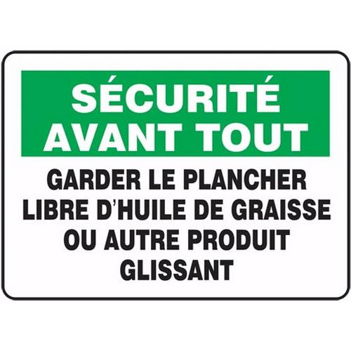French Sign with Legend: "Securite Avant Tout Garder Le Plancher Libre D'huile De Graisse Ou Autre Produit Glissant". Multilingual safety signs are used in order to keep all people in the workplace safe, regardless of their language.