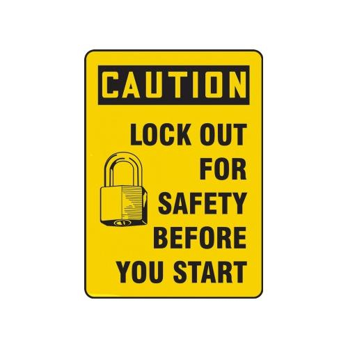 Accuform, MLKT628XV, 14" x 10" OSHA Caution Safety Sign "Lock Out For Safety Before You Start" Adhesive Dura-Vinyl