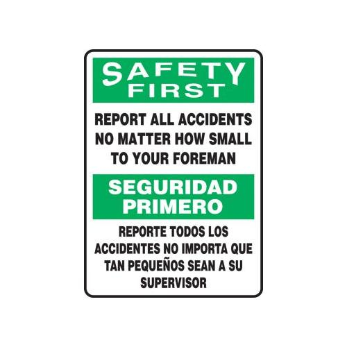 Accuform, SBMGNF910VA, 14" x 10" Bilingual OSHA Safety First Safety Sign "Report All Accidents No Matter How Small To Your Foreman" Aluminum