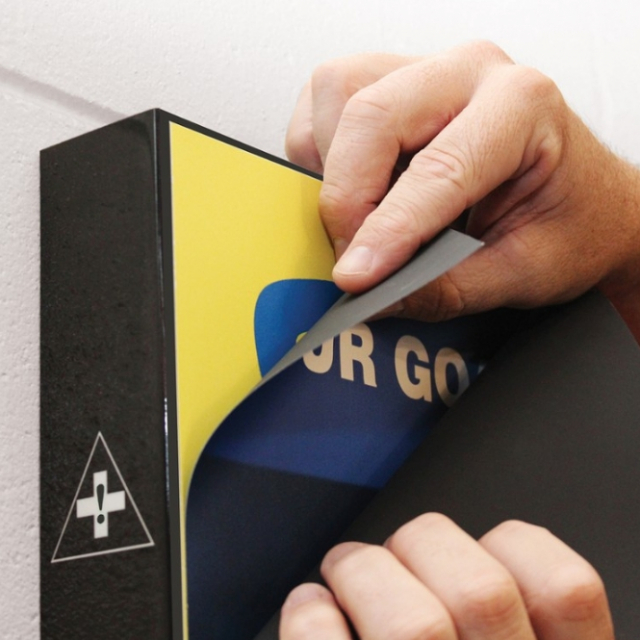Renewing your commitment to safety has never been easier. The Magnetic Digi-Day Electronic Scoreboard showcases your safety record with a variety of motivating, seasonal and custom safety messages on changeable magnetic faces. These ultra-thin magnetic faces adhere seamlessly onto the Standard or Deluxe Backboard for multi-layer storage and easy switching.