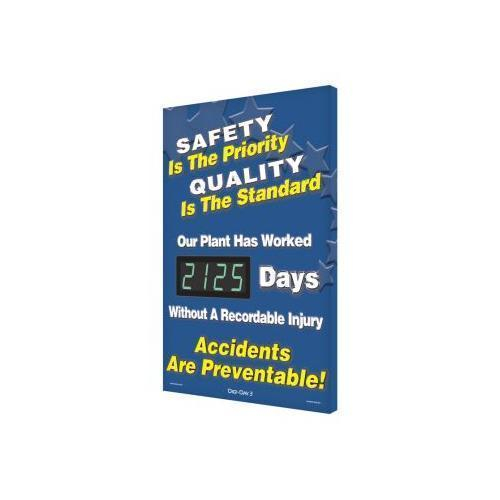 Accuform, SCK125, 28" x 20" Digi-Day 3 Electronic Safety Scoreboard "Safety Is The Priority: Quality Is The Standard: Our Plant Has Worked _ Days without A Recordable Injury"