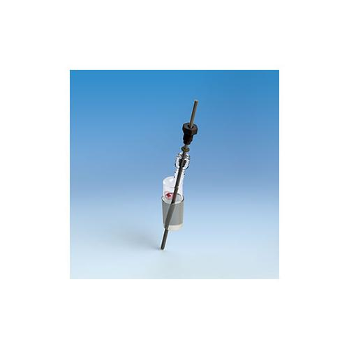 Thermometer adapter with inner joint at bottom and top threaded piece offset and angled approximately 10 degree for use in multiple neck flasks. Threaded Nylon bushing tightens into glass piece to form an O-Ring compression seal with thermometers, bleed tubes, etc. up to 7mm diameter. Thread at top allows for variable vertical positioning of thermometers, etc. also, because of the 10 degree angle, by rotating joint you can position the thermometer in the bottom of the flask. Supplied complete with Nylon bushing and FETFE O-Ring
