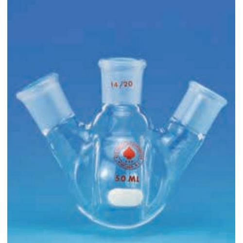 Three Neck (two angled). with indents to provide for more complete agitation. The nominal capacities referred to are the standard flask capacity without indents. The actual capacity is with indents. with 14/20 outer joints.