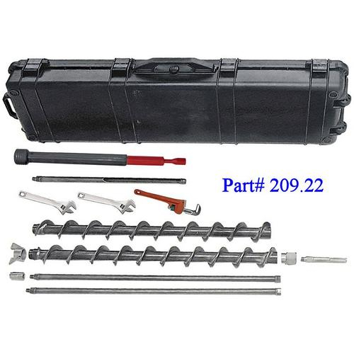 Prevent cross contamination with a cased access hole. The portable AMS Hollowstem auger kit provides the tools needed to reach a 6' depth. The augers cut a 3" diameter hole and have an ID of 1 1/8", making them suitable for soil, soil gas and groundwater sampling through a cased hole. A special Hollowstem soil probe, 7/8" OD by 24" long with slide hammer is included to allow collection of a soil sample through the auger. The AMS gas vapor probes may bae used through these augers telescopically. Bailers up to 1" diameter may be used to collect groundwater samples. Hollowstem Auger Kit Includes: Bosch model 11245, SDS max adapter, slide hammer, flighted lead auger, flighted extension, two 5/8" x 3' extensionsk hard surfaced tip, wrenches, nylon brush, AMS deluxe carrying case. Hollowstem lead section includes: SDS max adapter, 3' flighted extension, inner rod, plug, cap and tip.