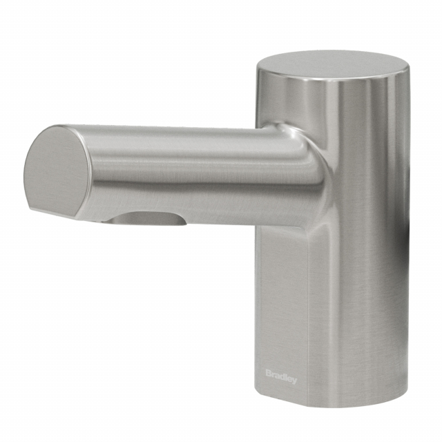 Individual top-fill soap dispenser with 70.5 oz (2.0 L) tank. Universal cylindrical design pairs with faucet model S53-3300. Matching soap and faucet designs that integrate seamlessly with Bradley lavatories or any handwashing fixture. Chrome-plated cast brass construction with environmentally friendly PVD finishes. Hidden sensors, nozzles, and anti-rotational gasket prevent vandalism. Smart Sense System - Elegant translucent ring at the base of each dispenser gives a glowing indication of low battery, low soap, and overflow conditions. Touch-free infrared sensor-operated.