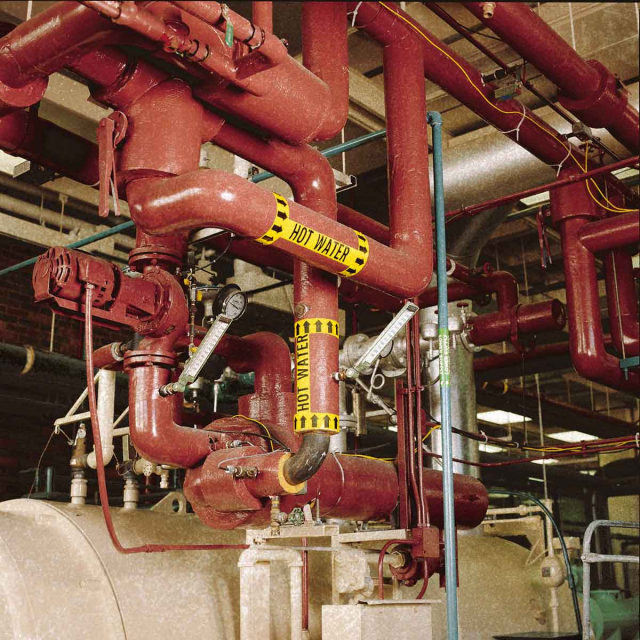 Self-sticking pipe markers from Brady® simplify installation with their factory-applied industrial-grade adhesives: simply peel off the backing and press the marker in place.
