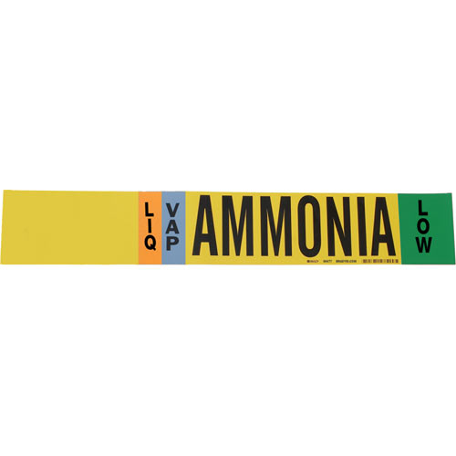 These IIAR-compliant pipe markers come with the traditional yellow background and are recommended for use in labeling ammonia piping and its contents.