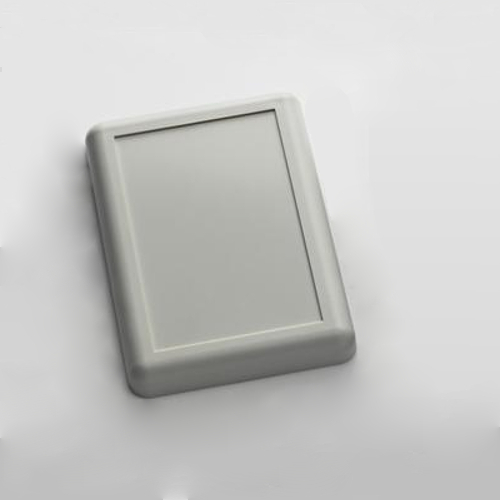 Style C is a smaller, more ergonomically shaped rectangular enclosure that includes a 9-volt/AA battery compartment and a removable end panel. It is made out of ABS plastic in a light gray finish, with UL94-HB flammability rating.