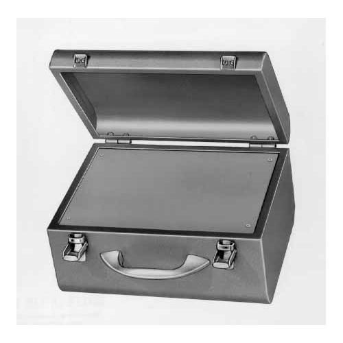 .04" aluminum body. Portable. Flush fitting .05" aluminum panel. Bright nickel-plated hardware. Black plastic handle. Plastic feet on base and back. Knobs, dials, switches, etc. protected by slide-off lid; 1.50" clearance above panel.