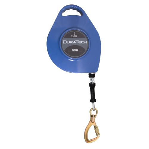 DuraTech 25ft Self-Retracting Device Is equipped with a side cable payout, aluminum housing, internal braking system, swiveling self-locking carabiner and a spring block shock with a grip handle all within a stackable design.