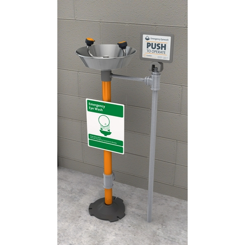 Freeze-resistant eyewash for pedestal mounting. Freeze-resistant valve and supply line are buried below frost line to protect against freezing. Unit is designed to drain completely after use, so that no standing water remains in unit and possibility of freeze-up is eliminated. Since unit is intended for use in cold weather conditions, consideration should be given to supplying unit with tempered water in accordance with ANSI Z358.1-2014.