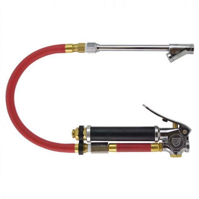 This tire inflator features pressure range of 10-120 PSI in 2 PSI increments and has chrome plated metal casting, precision machined brass internal parts, and Buna-N (Nitrile) O-rings. It is a heavy duty inflator for large trucks. This kit includes a Red Rubber Hose Whipend, 12" long with & 6" Straight-In Dual Foot Tilt Lock Truck Chuck (T08). Tire inflator hose assembly with ultra-flexible oil and ozone resistant rubber hose, brass fitting and chuck.