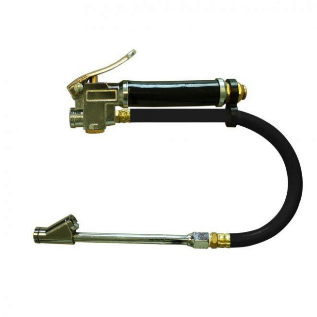 This tire inflator features pressure range of 10-120 PSI in 2 PSI increments and has chrome plated metal casting, precision machined brass internal parts, and Buna-N (Nitrile) O-rings. It is a heavy duty inflator for large trucks. This kit includes a Black Steel Braided Hose Whipend, 12" long with & 11" Straight-In Dual Foot Tilt Lock Truck Chuck (T08L). Tire inflator hose assembly with ultra-flexible oil and ozone resistant rubber hose, brass fitting and chuck.