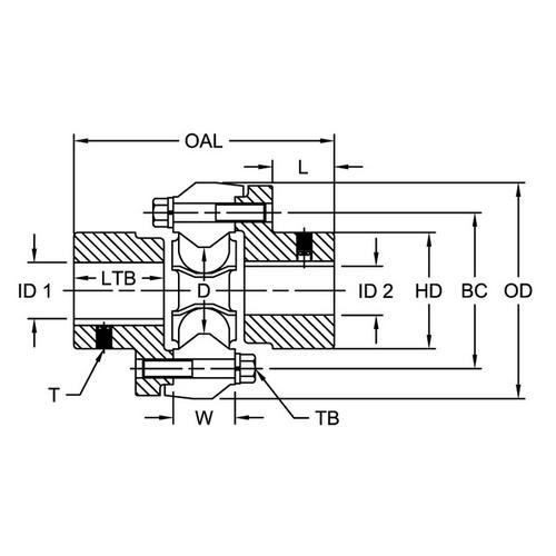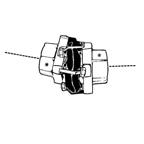 Saga is a general purpose, torsionally soft coupling with high tolerance to all forms of misalignment. The design features hexagonal or octagonal rubber donut-shaped elements with metal inserts positioned at each apex during the vulcanization process. These metal inserts carry actual bolts which fix the element to tines on cast, cylindrical hubs. Embedded inserts also have tines which connect with mating surfaces on hubs so that axial bolts can be easily torqued during assembly without twisting the rubber beyond the limits of its elasticity. The rubber between each apex is pre-compressed, so it is much more durable to the stresses arising from the various forms of misalignment and torsional vibrations.