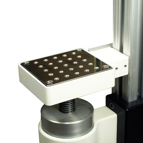 A large hand wheel requires little effort, even at high loads, and a precision Acme screw and nut ensure smooth operation over time. The stand includes a loading table with threaded holes for fixture or grip mounting and a solid metal base contains a storage pocket and holes for bench mounting.