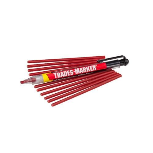 TRADES-MARKER has the marking versatility of a paper-wrapped grease pencil combined with simple push-button advance that helps reduce cost and waste. This refillable, all-surface marker leaves a wear-resistant mark and is safe for all surfaces.