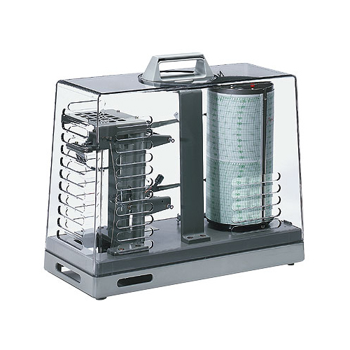 Made of corrosion- resistant acrylic for indoor or sheltered outdoor use. Spring winding keeps chart running for eight days. Even when the motor begins to run down, a steady chart speed is maintained. Includes one 1-day gear and one 7-day gear, two felt-tipped pens (red and blue), and one 7-day rotation chart.