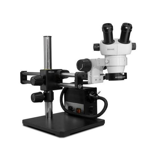 Scienscope, ELZ-PK5D-AN, ELZ Stereo Zoom Binocular, 10x Eyepieces, Eye Guards, Dual Arm Boom Stand with 76mm E-Arm, 0.5x Auxiliary Lens, LED Fiber Optic Illuminator, Fiber Optic Annular Ring Light Guide