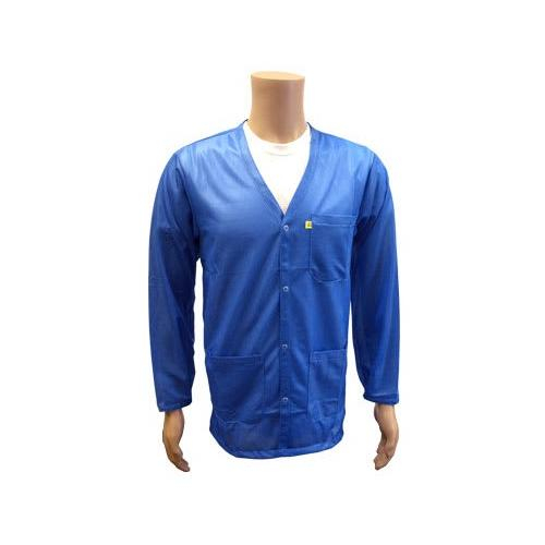 The Transforming Technologies JKV9021SPLB 9010 Series ESD Lab Jacket provides high quality ESD protection and made from a medium-weight blend of 90% polyester and 10% conductive fibers. It features a snap front closure with a V-neck collar and also has snap cuffs and three roomy patch pockets.