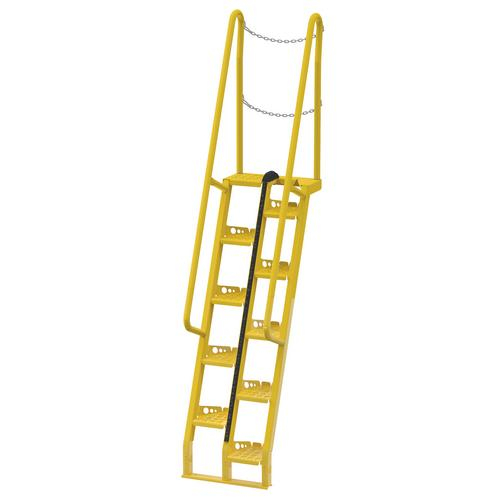 Alternating-Tread Step design offers a shorter span than traditional steps. Features handrail on each side of unit, dual safety chain at the top of the stair and formed steel steps with raised surfaces for better traction. Welded steel construction with bolt-on handrails. Baked-in powder coat finish for added toughness. Meets OSHA specification 29 CFR 1910.25. Ships knockdown for lower freight costs.