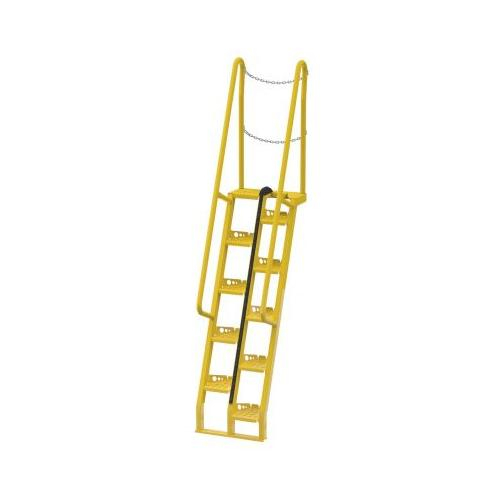 Alternating-Tread Step design offers a shorter span than traditional steps. Features handrail on each side of unit, dual safety chain at the top of the stair and formed steel steps with raised surfaces for better traction. Welded steel construction with bolt-on handrails. Baked-in powder coat finish for added toughness. Meets OSHA specification 29 CFR 1910.25. Ships knockdown for lower freight costs.