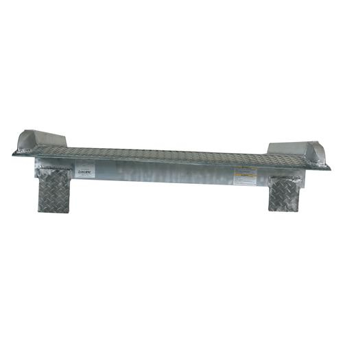 The Aluminum Truck Dockboard is engineered and built to maximize safety while handling heavy fork trucks and loads. The beveled edge is designed for smooth entry and exit. Locking legs prevent movement during loading and unloading operations. Locking legs are uneven to allow the dockboard to sit canted, while not in use, for easier pickup by fork trucks. Welded aluminum safety curbs prevent accidental runoffs and provide visible driving lane. When using three-wheeled fork trucks order dockboard with capacity at least four times the lifting capacity of fork truck. The width of the dockboard should be at least 15 (in.) wider than the load or equipment passing between the curbs. Bend is 11° and 9" from the edge and the legs are 12" from the edge. Manufactured in compliance with OSHA.