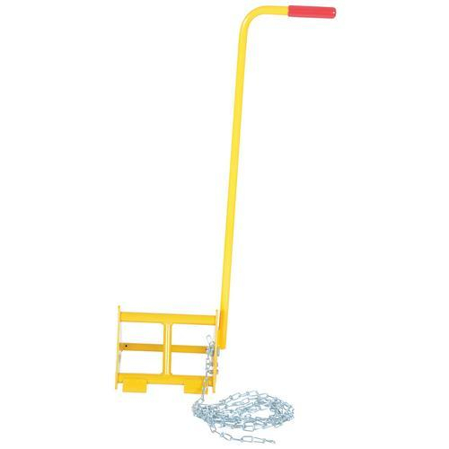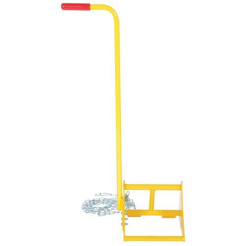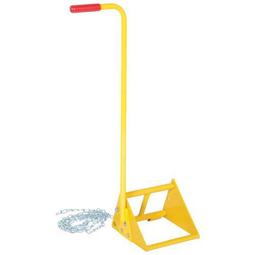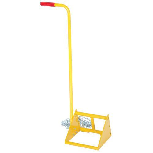 Ergonomically designed to make it easy to move wheel chocks in and out of position under trailer wheels. Reduce the risk of back, knee, and foot injuries. Handle is constructed of steel and includes a yellow baked-in powder-coated toughness. Assembly required. D-Ring provided for attaching a security chain. Chain not included.