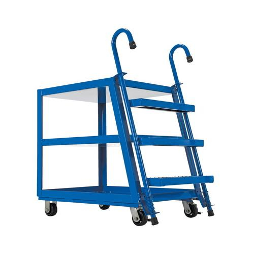 Combine the mobility of a cart with the versatility of a step ladder with this Stockpicker Truck. Convenient spring loaded step ladder holds the cart securely in place while a person is standing on the ladder. Crutch tip ladder prevents the cart from moving while stocking. Springs then return the ladder to the raised position once personnel exit the step. All shelves have the lip turned up to prevent items from falling off.
