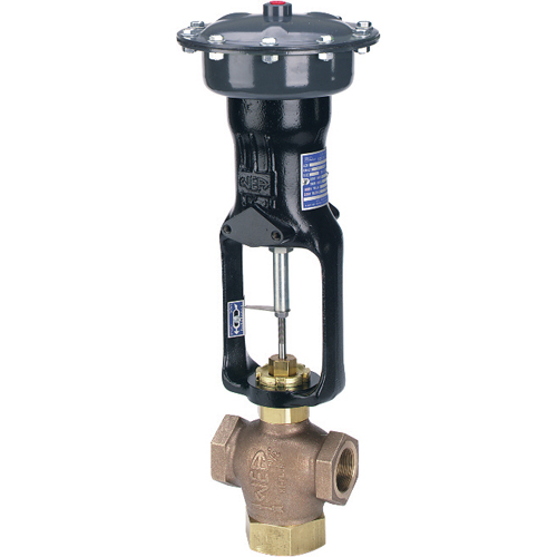 Valve Type and Size: 3-way, 2" NPT Push-to-Close Valve, Body Material: Bronze, Actuator: Lin-E-Aire®, Air-To-Lower, 80 in²